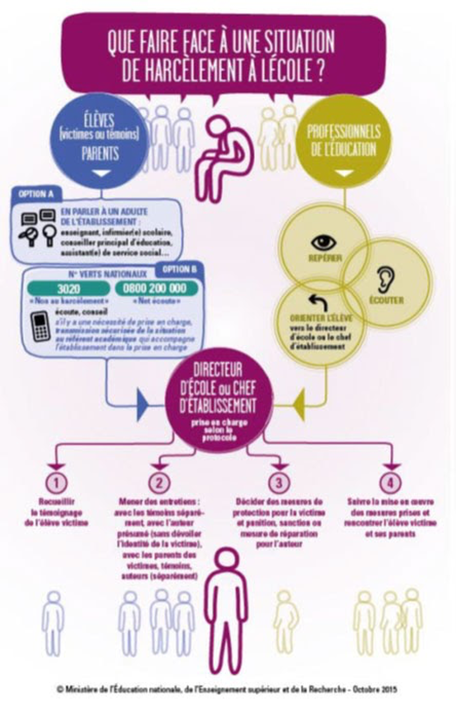 - Ecouter si la victime vient à parler sans la JUGER, sans BANALISER et l’orienter vers un médiateur, voire le doyen ou le directeur de l’établissement