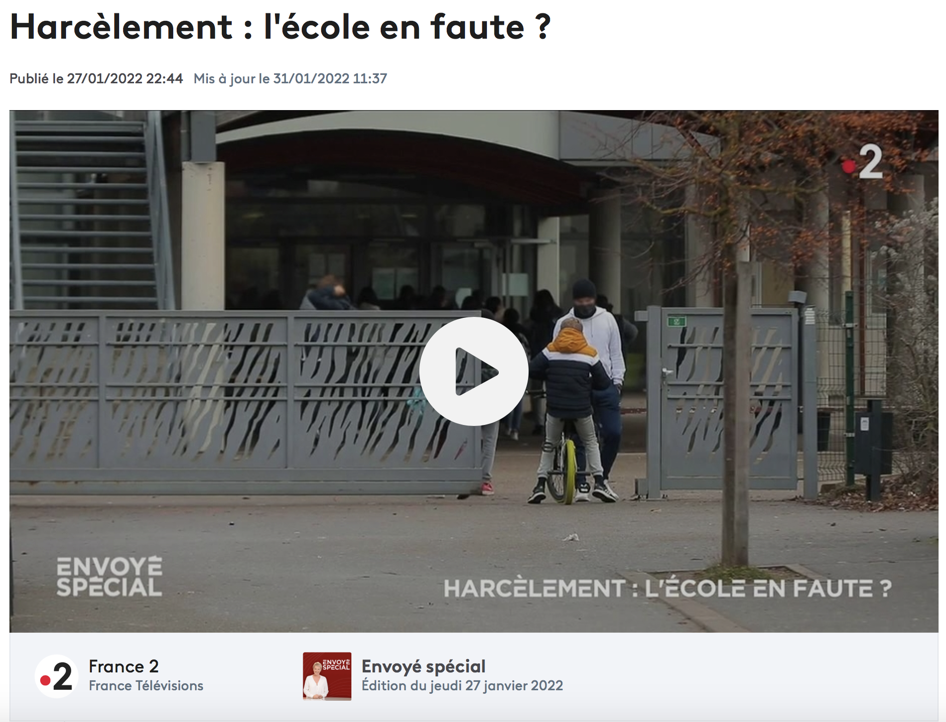 Retrouver l’article de FranceInfo ici : https://www.francetvinfo.fr/societe/education/harcelement-a-l-ecole/video-harcelement-l-ecole-en-faute_4930217.html