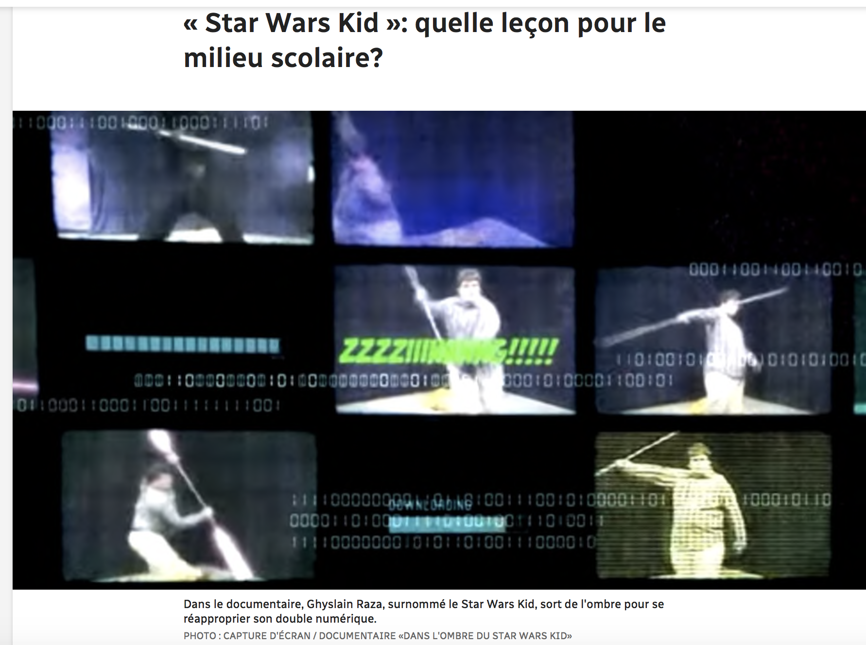 Radio Canada annonce et analyse la sortie d’un documentaire sur la vidéo de Ghislain Raza, surnommé en 2003 le Star Wars Kid. Il s’agit d’une vidéo qui avait été mise en ligne sans son consentement, qui était devenue virale sur internet et avait amené Ghislain Raza à quitter l’école. Ce jeune homme a été l’un des premiers à vivre la « cyber-Intimidation » à cause de cette vidéo vue un milliard de fois dont tout le monde disait qu’il y « bouge mal ». Cette situation a amené des questions relatives à la vie privée et a connu une forte couverture médiatique mondiale.